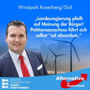 Udo Stein, Sprecher des AfD-Kreisverbands Schwäbisch Hall / Hohenlohe und Vorsitzender des Arbeitskreises „Ländlicher Raum und Verbraucherschutz“ der AfD-Landtagsfraktion verurteilt in seiner Eigenschaft als Mitglied des Petitionsausschusses das jetzt zu Ende gegangene Petitionsverfahren „Windkraft Rosenberg-Süd“, das ohne Entscheidung über Annahme oder Ablehnung der Petition und damit ohne Beschlussempfehlung an den Landtag und an die Landesregierung zur abschließenden Entscheidung geleitet wurde. Die Petition war von Mitgliedern der Bürgerinitiative „Windkraft mit Vernunft“ eingereicht worden. Sie richtet sich gegen den Bau von ursprünglich drei geplanten und bis zu 230 m hoch werdenden Windkraftanlagen. In der Planungsphase hat der Projektierer EnBW die Anzahl der WKAs zunächst auf zwei WKAs reduziert.