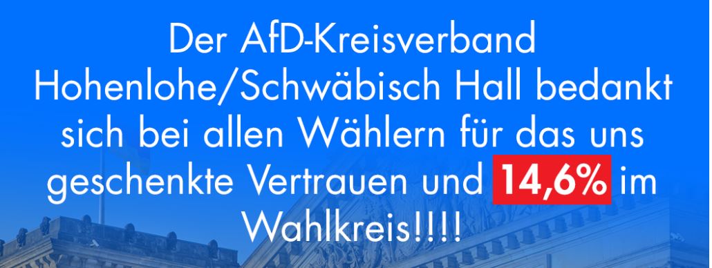 Im Namen des AfD-Kreisverbandes Hohenlohe/Schwäbisch Hall bedanke ich mich bei allen Wählern und Unterstützer der AfD, sowie unseres Direktkandidaten Stefan Thien! VIELEN DANK! Jetzt „rocken“ wir den Bundestag!