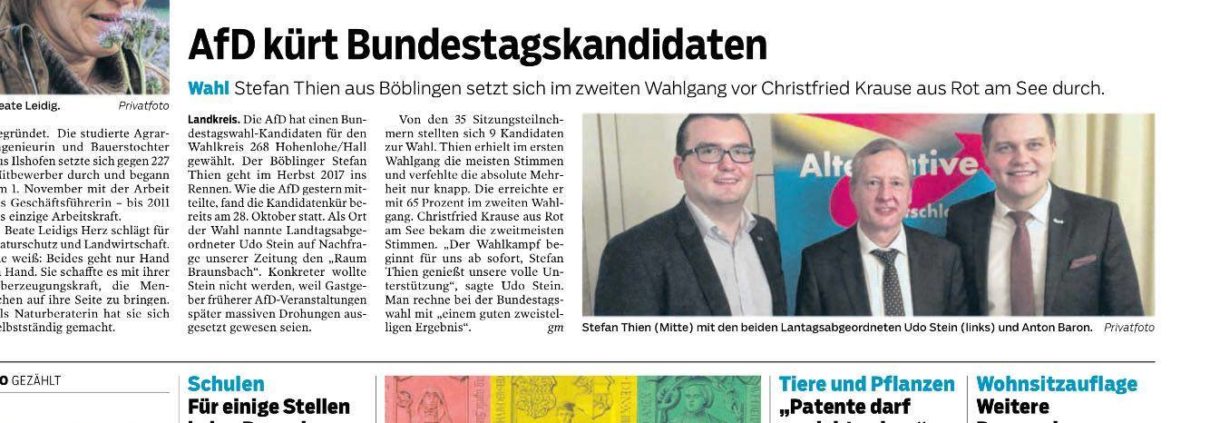 Die heutige Pressemeldung im Haller Tagblatt, bezüglich unserer Aufstellungsversammlung zur Nominierung von Stefan Thien als unseren Bundestagskandidaten.